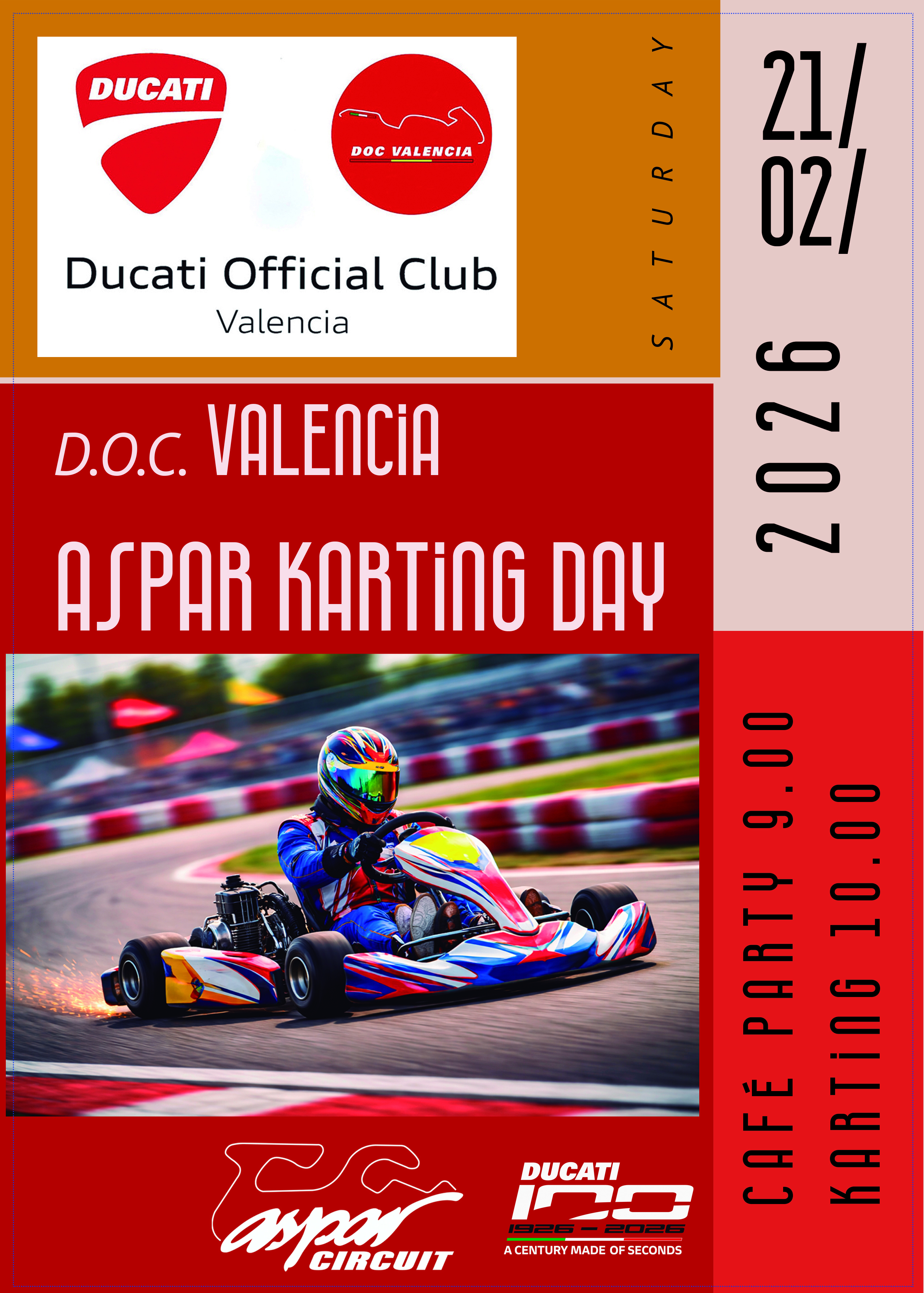 Comenzamos 2026 celebrando el centenario de Ducati con un año repleto de actividades diseñadas para fortalecer la comunidad de nuestro D.O.C. La primera cita será el D.O.C Valencia Aspar Karting Day , como miembro del DOC Valencia, disfrutarás de un descuento exclusivo para vivir una mañana llena de adrenalina y pasión por el motor.